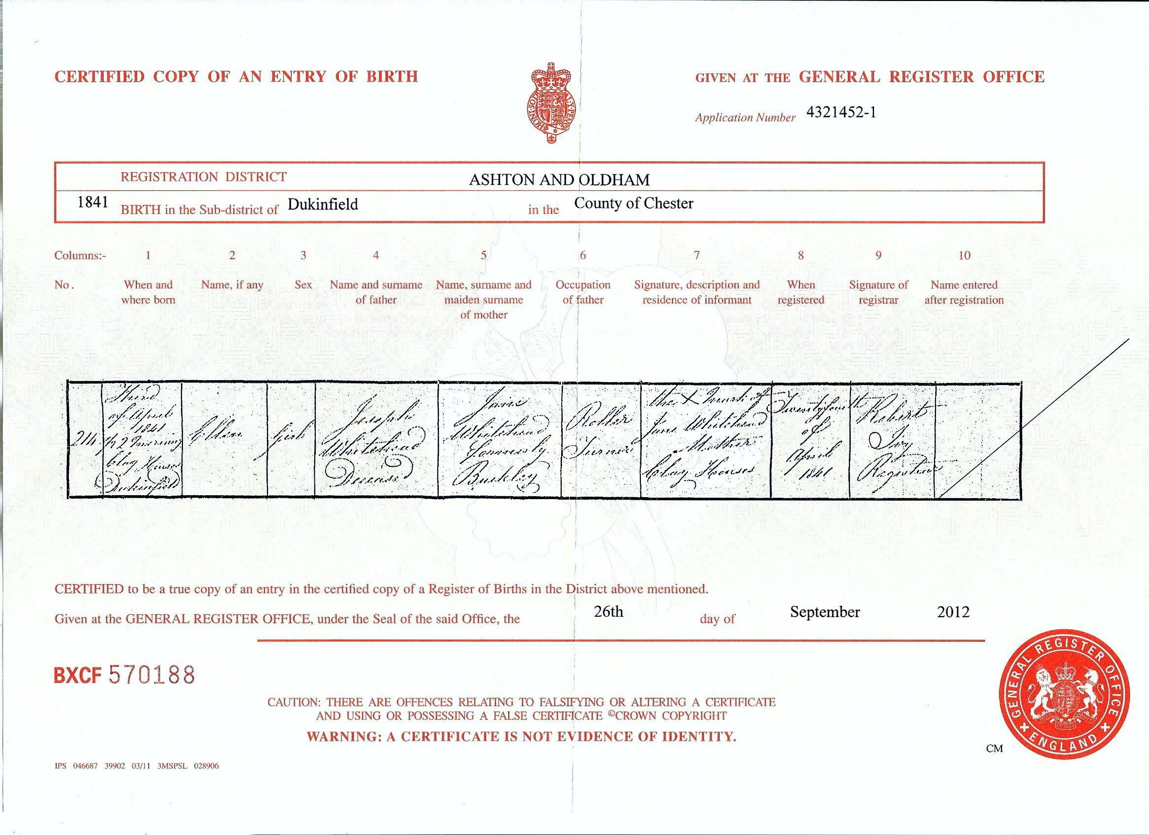 - Joseph Whitehead register of birth 01 June 1803, St. Mary’s, Oldham, Lancashire, England, parents listed as Joseph Whitehead and Mary (no surname)