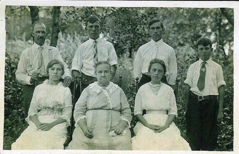 James Schofield, son Tom, son-in-law George Frew, son Lee. Sitting, daughter Doris Schofield, mother Ellen Whitehead Schofield, daughter Ellen Ada Schofield Frew
