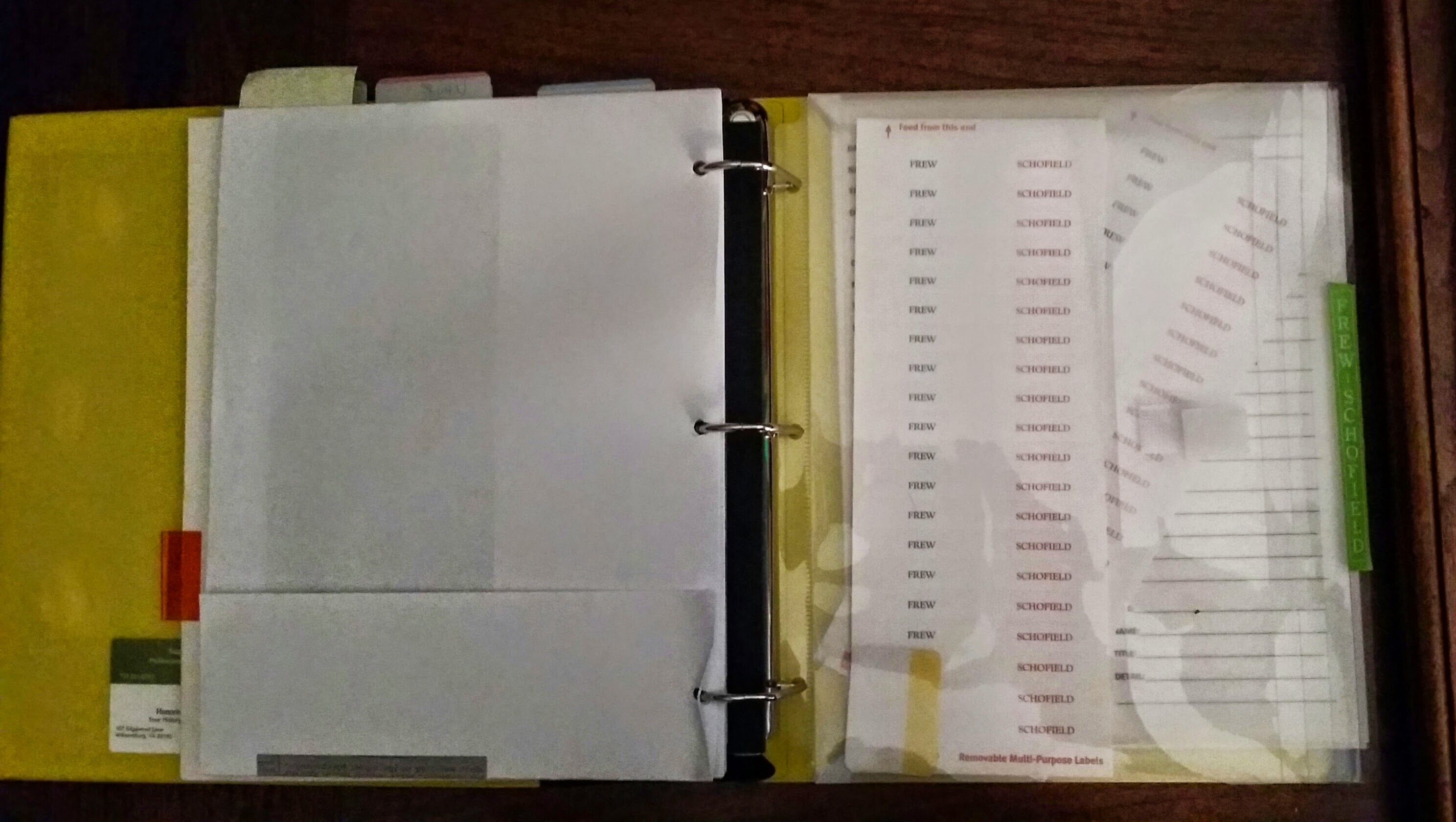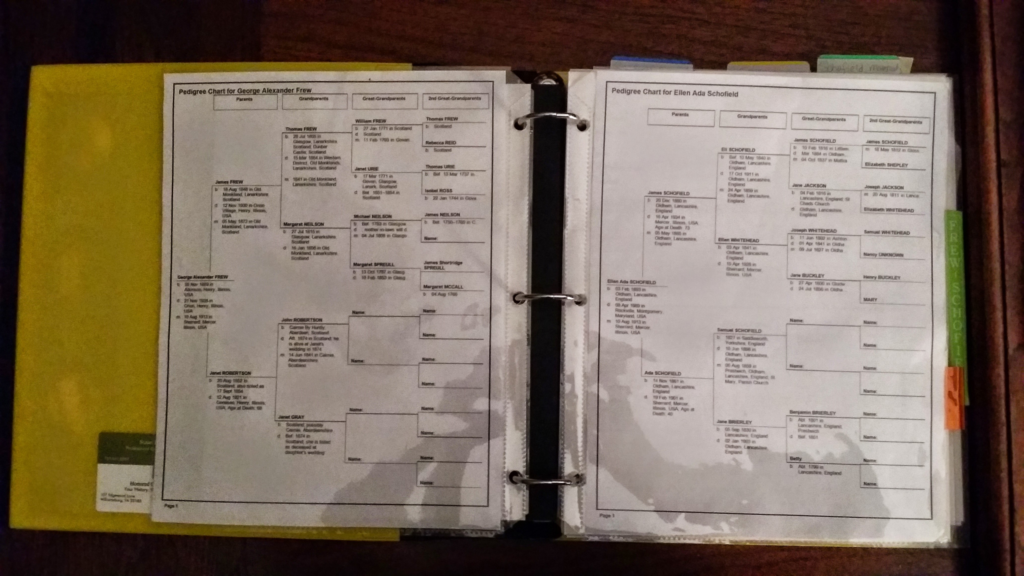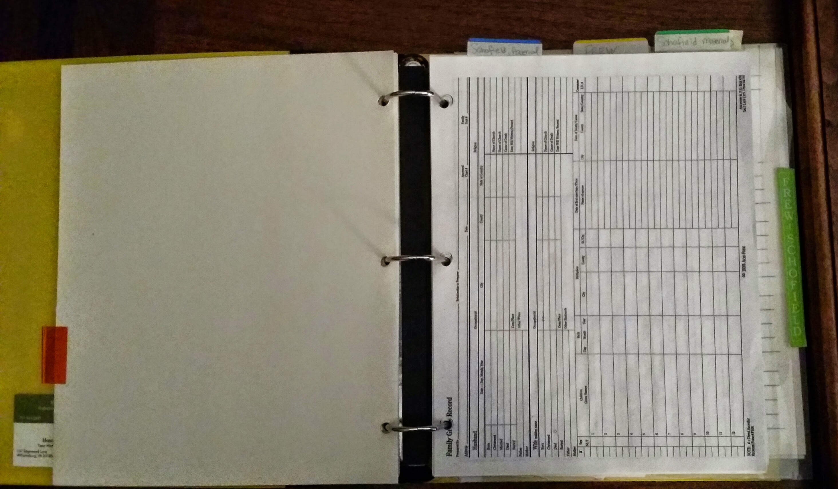 Now, as I am researching a particular branch I pull out the appropriate binder which has all the tools I need; note paper, forms, etc and can stay focused. I can take the binder with me wherever I go and have things easily available. I also have research spreadsheets, source extract forms, and other useful tools in the binders.